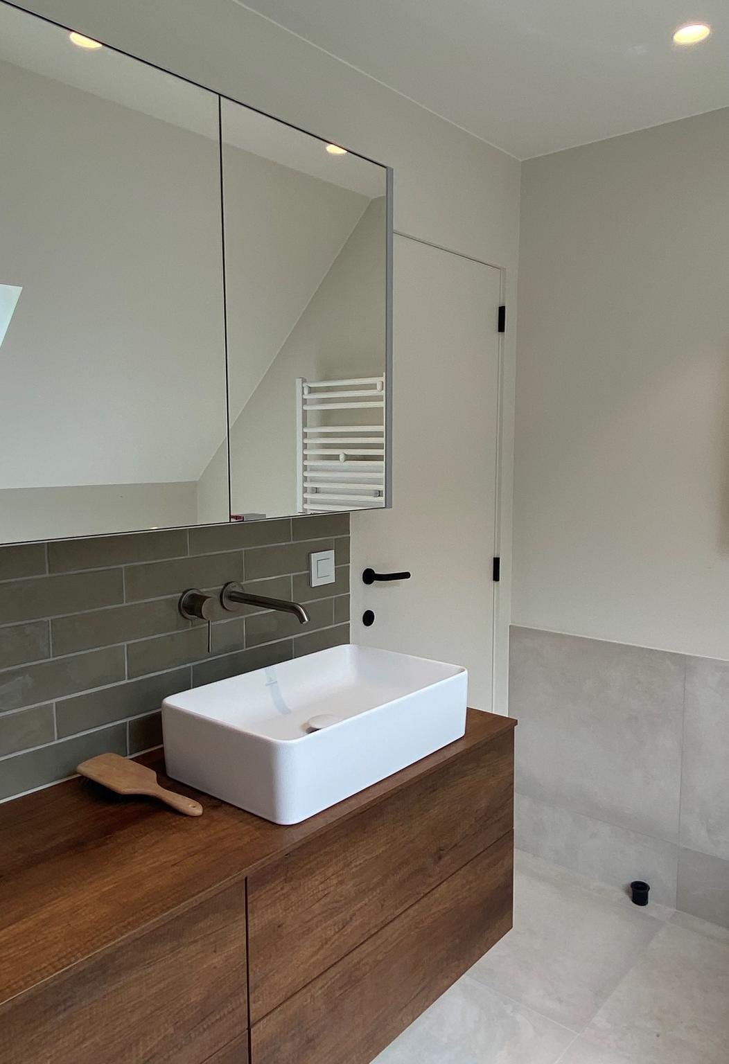 Zelliges in zalig olijfgroen maken de badkamer rustig en één geheel. Uw oase van rust.